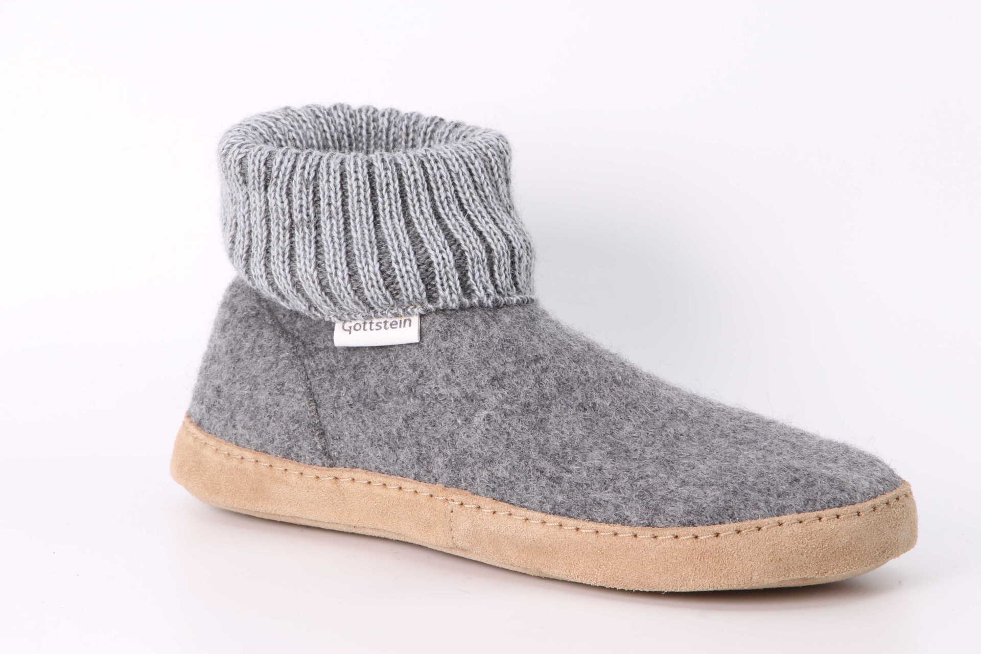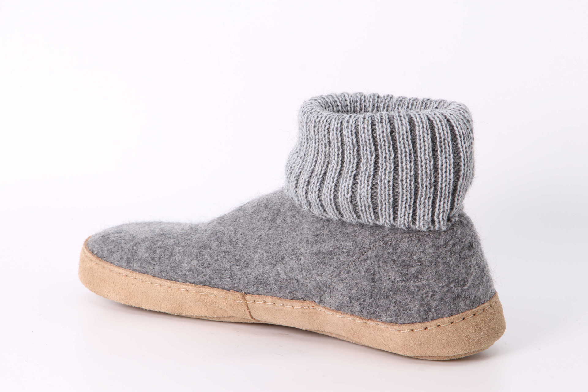 Dakota Hüttenschuh für Damen und Herren. Das Obermaterial aus robusten Walkstoff wird aus 100% Schafwolle gefertigt. Die gepolsterte Ledersohle ist besonders weich und bequem. Mit diesem Hüttenschuh läuft man leise und weich wie auf Wolken. Das Rippbündchen sorgt für eine gute Passform und ein angenehmes Tragegefühl. Der Walkstoff wird mit viel Expertise in einer Manufaktur für diesen Hüttenschuh hergestellt und mit reinem Tiroler Gebirgswasser, ohne jegliche Zusätze, gewalkt. Das Rippbündchen wird von einem Strickmeister mit viel Liebe zum Detail gestrickt und der Zuschnitt aller Teile inklusive Sohle erfolgt in einer Manufaktur in Tirol.