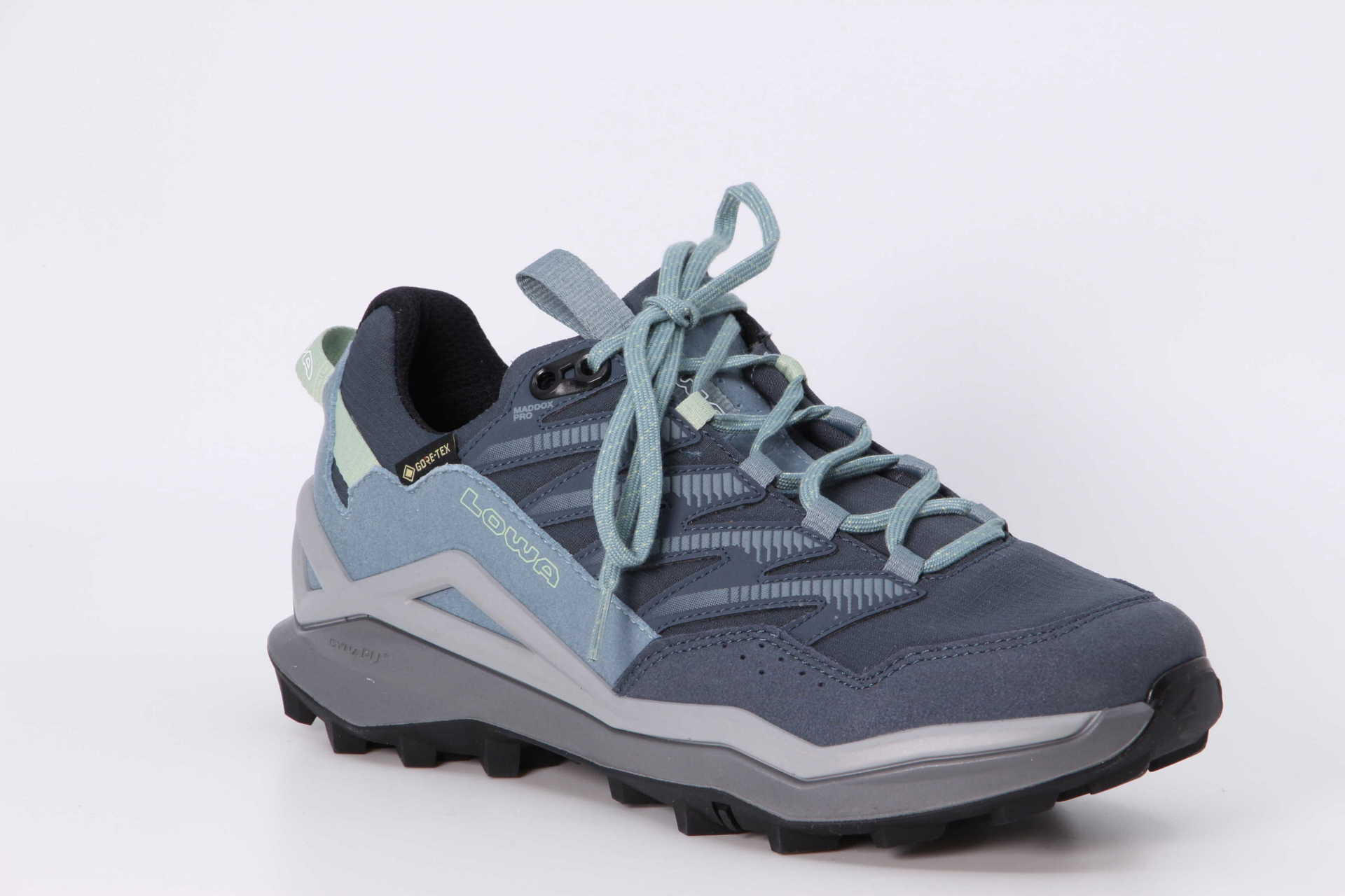 Für Abenteuerlustige und Adrenalinjunkies ist der MADDOX PRO GTX das Ticket zu unvergleichlicher Performance und Agilität. Egal ob steile Steigungen, dichte Wälder oder roughes Mittelgebirgsterrain – der Leichtwanderhalbschuh hält dynamisch Schritt. Seine Passform beeindruckt wie die einer zweiten Haut, die scharf profilierte LOWA® FAST HIKING-Sohle liefert hervorragenden Grip. Das bewährte Zwischensohlensystem aus LOWA® DYNAPU® als auch das leichte, atmungsaktive Ripstop-Obermaterial gewährleisten ein sportliches Mass an Flexibilität – sodass der MADDOX PRO GTX gediegenere Tempi als auch dynamische Fast-Hiking-Passagen problemlos meistert. Dank einer GORE-TEX-Membran ist er darüber hinaus absolut wasserdicht. Das Naturell des Schuhs spiegelt sich auch in seinem optischen Auftritt wider: Mit dem scharfkantigen, präzisen Design ist der MADDOX PRO GTX ein wahrer Eyecatcher und setzt einen spannenden Akzent im Segment dynamischer Light-Hiking-Halbschuhe.