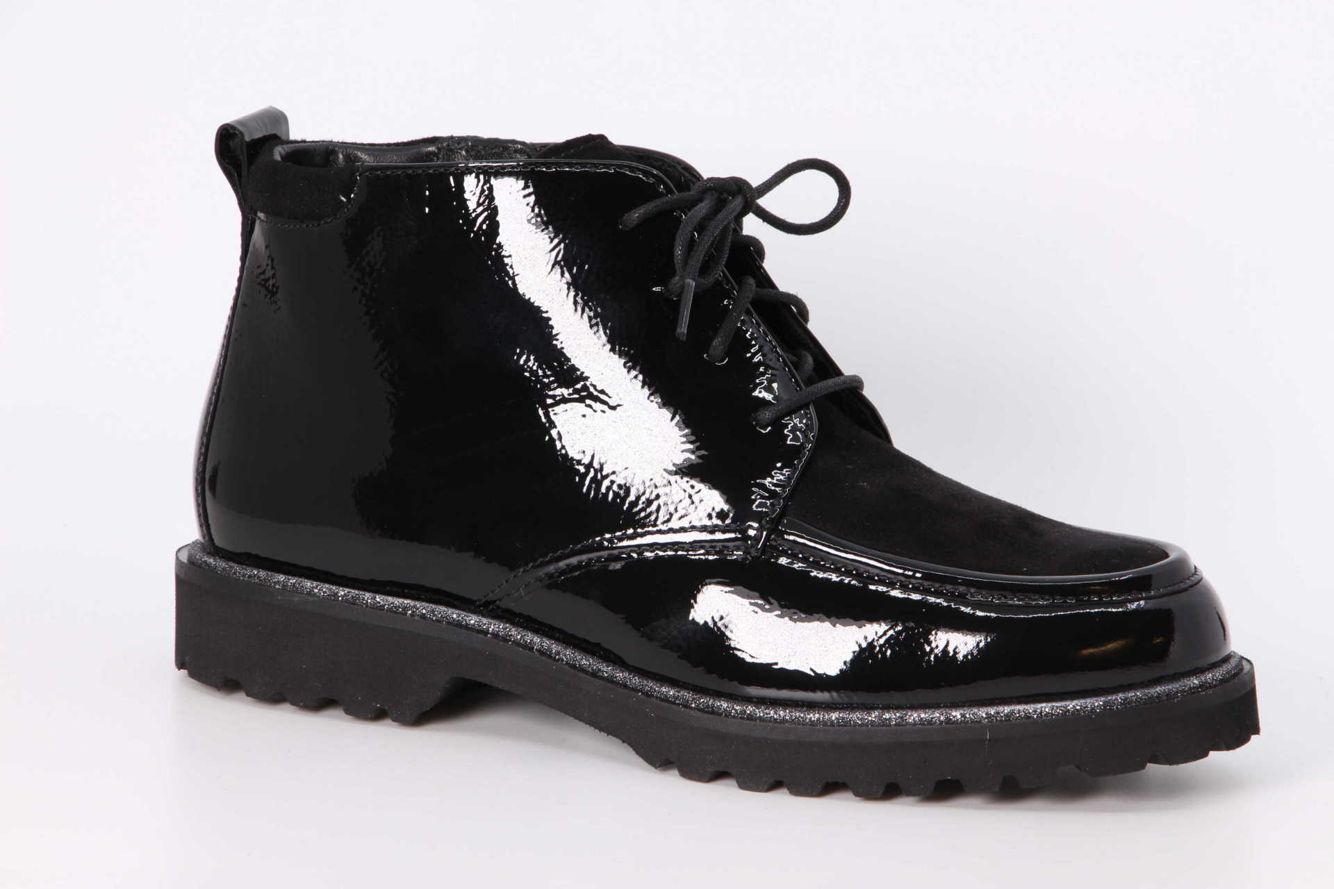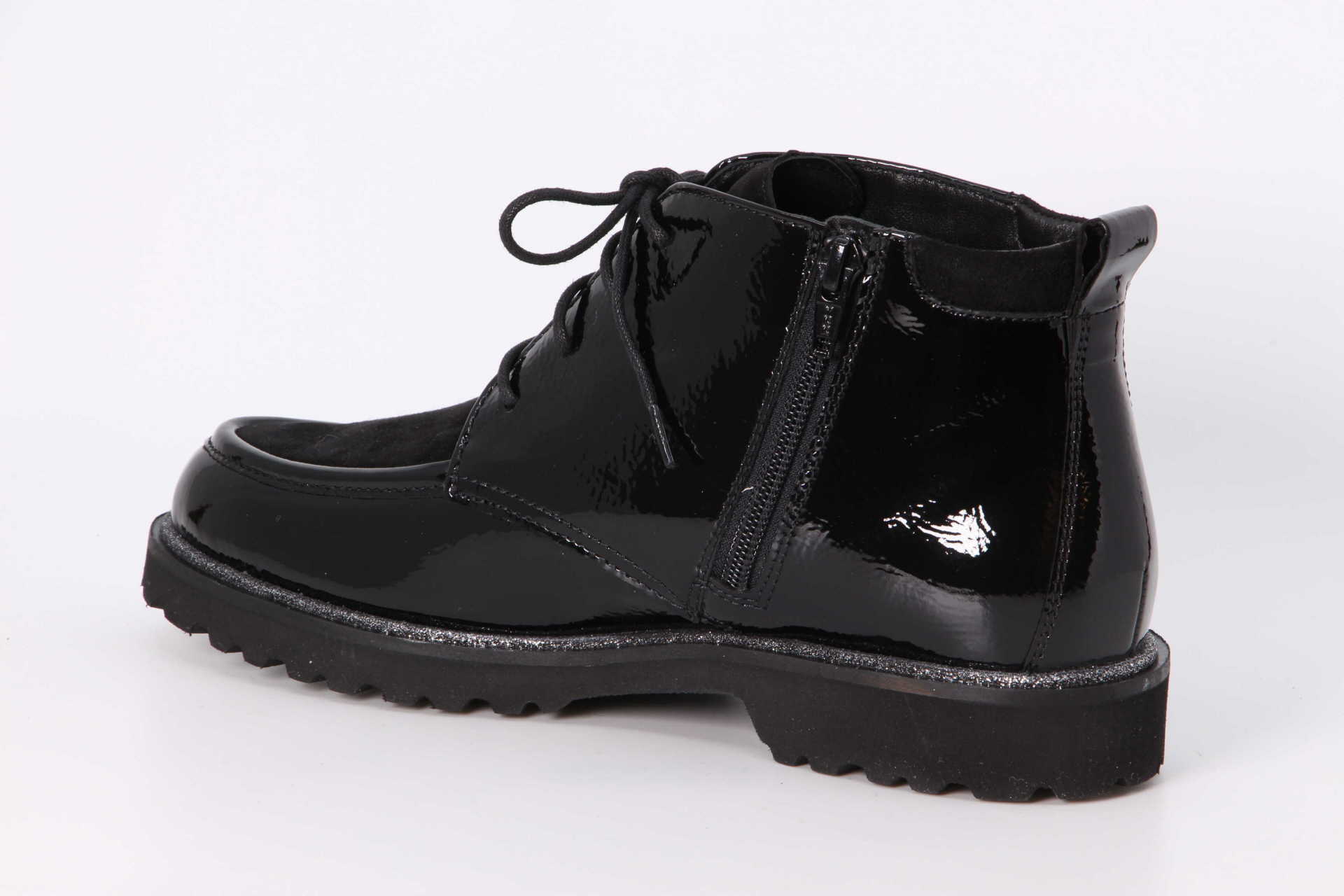 Der Damen-Schnür-Bootie in bequemer H-Extra-Weite ist ausgestattet mit einem seitlichen Reissverschluss zum leichten An- und Ausziehen. Das Modell ist aus Knautschlack-Leder gefertigt und gefüttert mit einem leichten Warmfutter! Die herausnehmbare, filzbezogene Decksohle mit weicher Dämpfung ist somit auch geeignet zum Austausch mit der eigenen Einlage. Profilierte, herbstlich anmutende Leichtgummisohle verfügt über einen modischen Glitzereffekt-Rahmen.