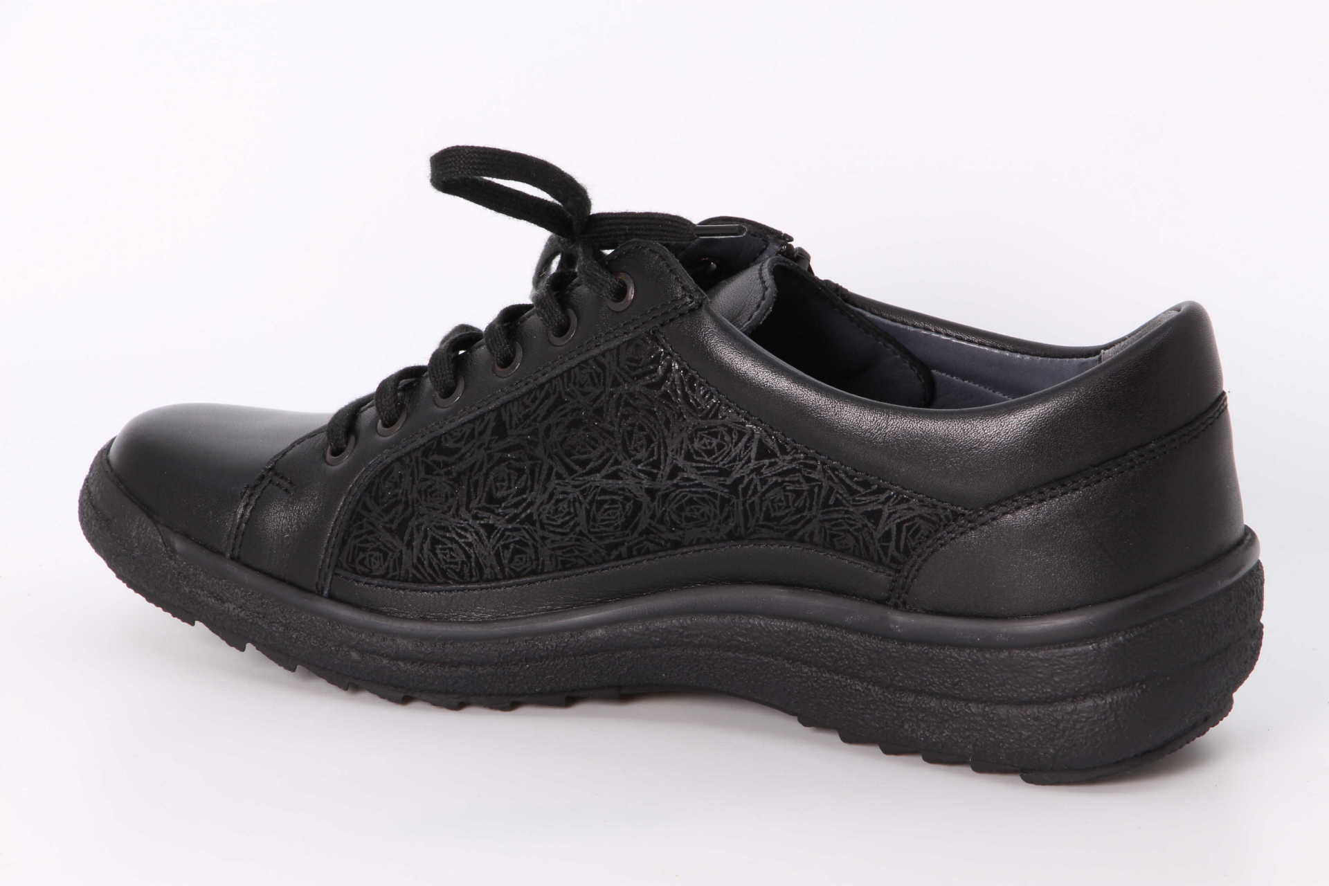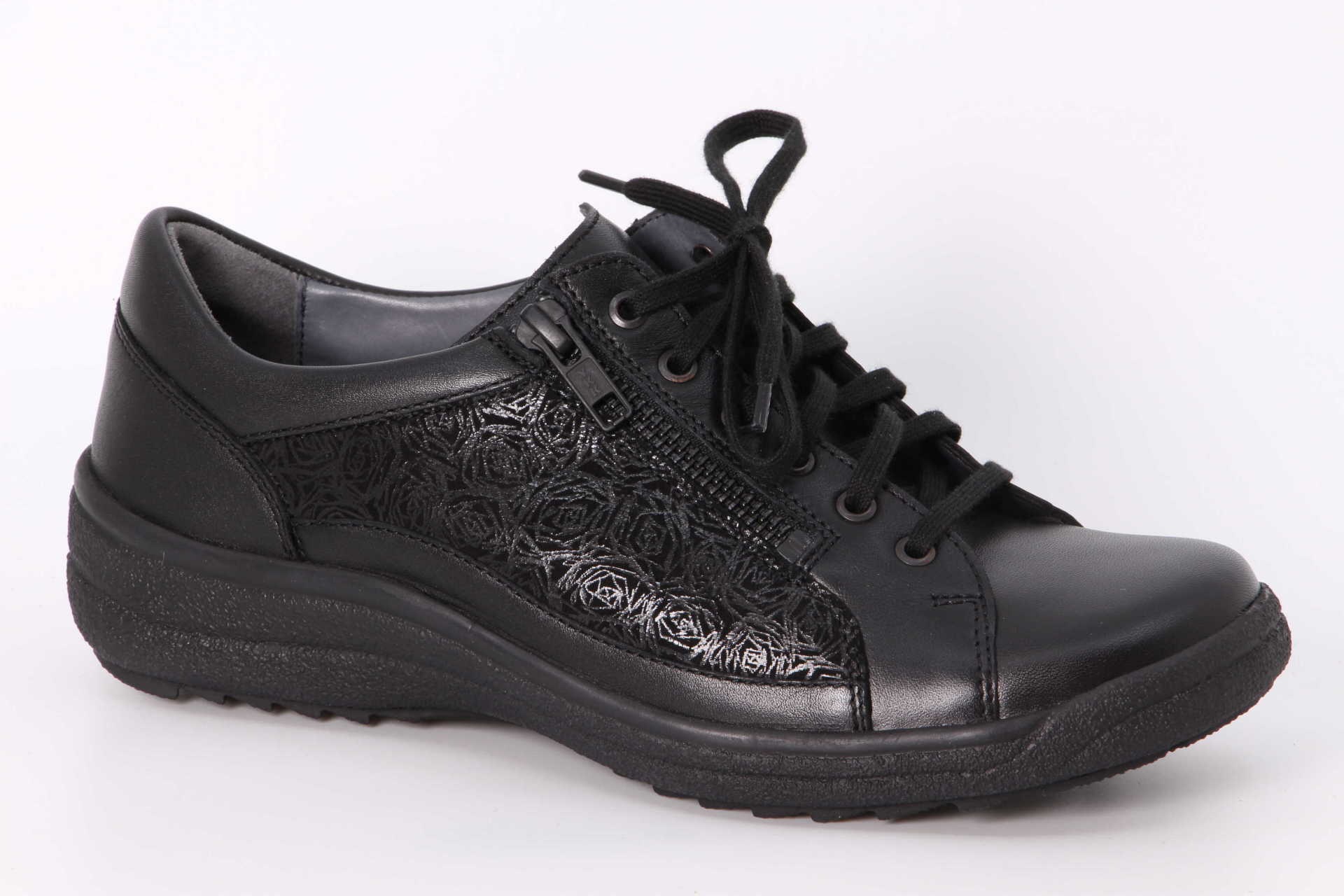 NINA mit robuster Sohle, perfekt für Herbst- und Wintertage. Kombiniert ist Nubuk- und Velourleder in spezieller Floweroptik. Die pfiffige Verschlussidee „Schnürung plus Reissverschluss“, lässt sich herrlich an den Fuss anpassen. Einmal auf Passform geschnürt, lässt sich das Modell künftig bequem über den Reissverschluss An- und wieder Ausziehen. Mit hautfreundlichem Kalbleder-Futter und top-bequemen Vario-Kork-Fussbetten ausgestattet. Natürlich können Sie auch bei NINA Ihre persönlichen, orthopädischen Einlagen einsetzen. NINA ist erhältlich in der Komfortweite H.
