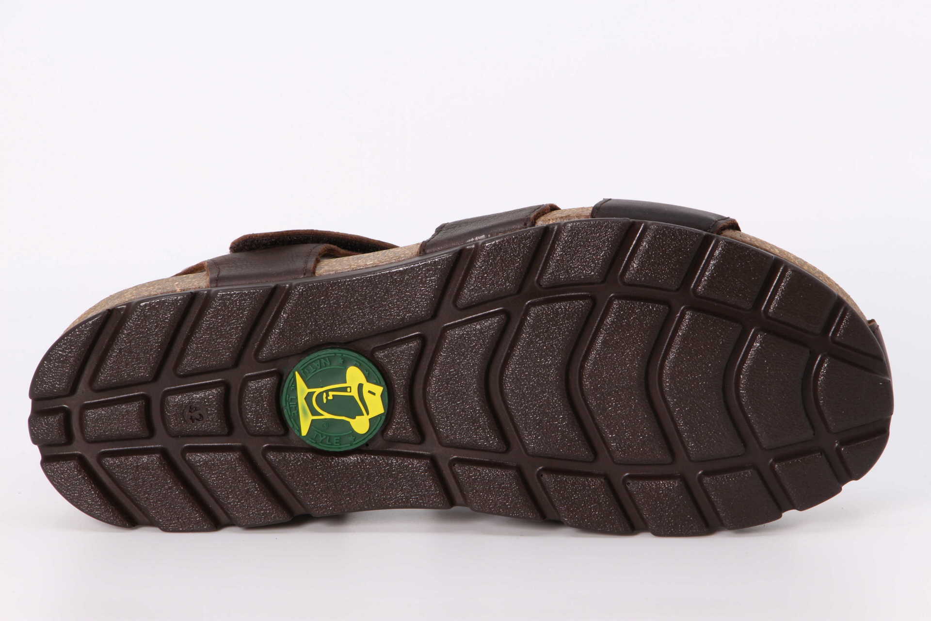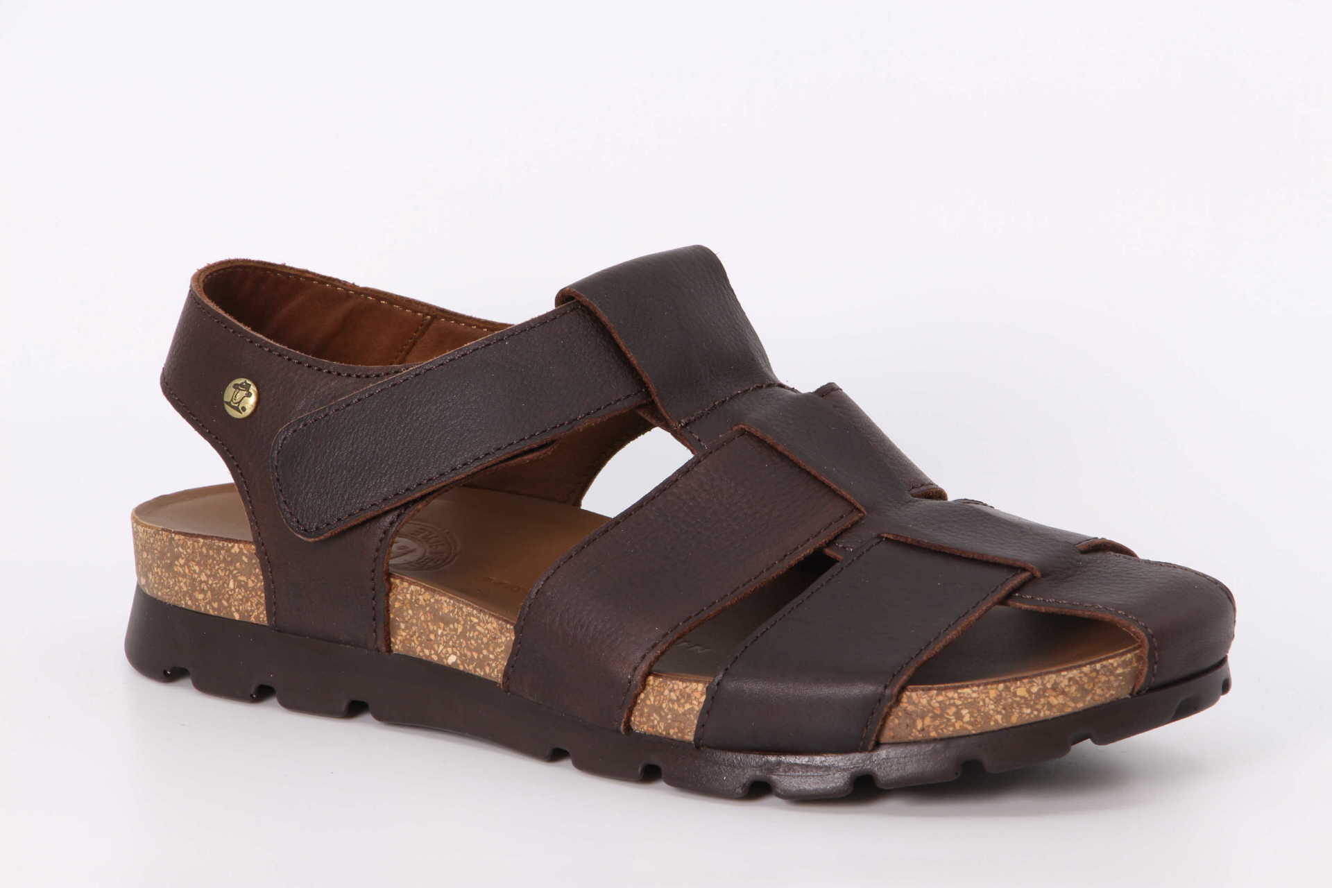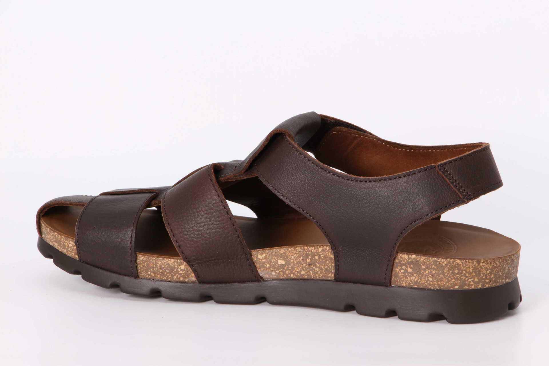 Herrensandale. Geöltes WATERPROOF Nappaleder. Klettverschluss. Lederinnenfutter. Anatomisch Innensohle. Flexible und robuste Sohle aus Kork und Polyurethan. 100% Hergestellt in Spanien.