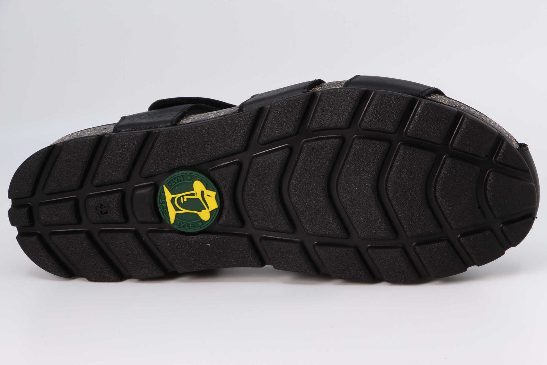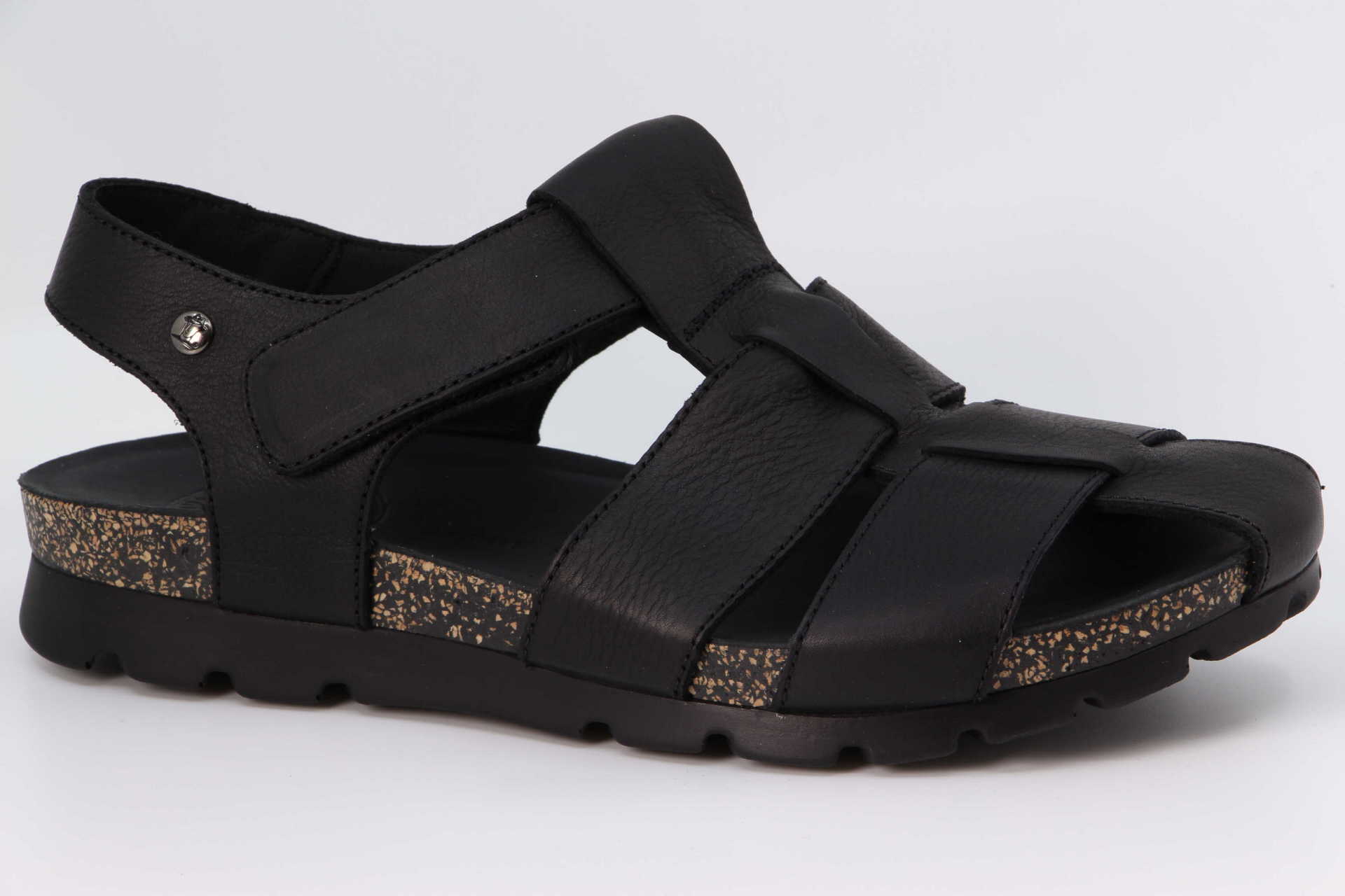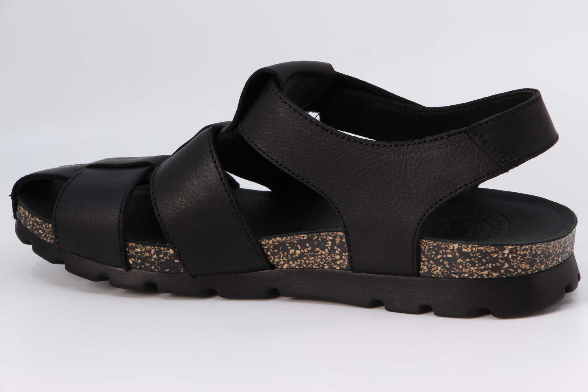 Herrensandale. Geöltes WATERPROOF Nappaleder in Schwarz. Klettverschluss. Lederinnenfutter. Anatomisch Innensohle. Flexible und robuste Sohle aus Kork und Polyurethan. 100% Hergestellt in Spanien.